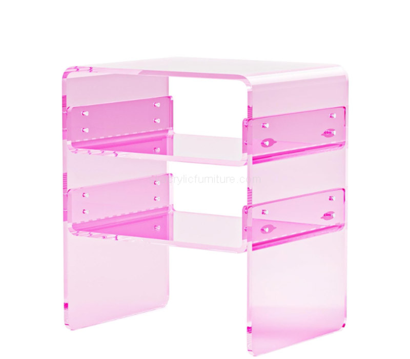 This custom acrylic 3-tier living room side table offers a sleek, translucent pink design with three tiers for stylish storage. Perfect for modern decor, it’s available exclusively for wholesale, making it an ideal bulk addition to contemporary living spaces.