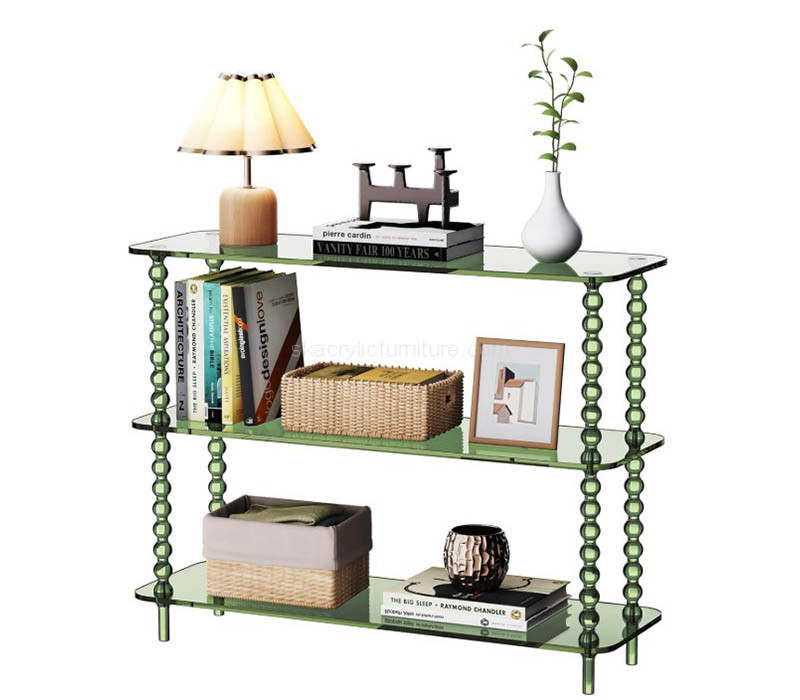 Custom translucent green acrylic 3-tier hallway table with storage showcases a modern, minimalist look with a fresh pop of color. Crafted from durable, premium acrylic, it features three spacious tiers for organizing décor, shoes, or daily essentials. Perfect for hallways, entryways, or retail spaces, offering both practical storage and stylish visual appeal.