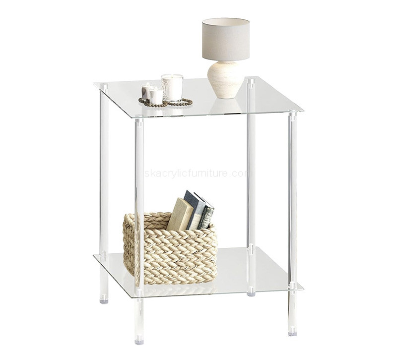 Custom acrylic end table with storage shelf combines minimalist style with everyday functionality. Crafted from durable, high-clarity acrylic, it offers a smooth polished finish and sturdy structure. The open storage shelf provides convenient space for books or décor, making it ideal for living rooms, bedrooms, or offices.