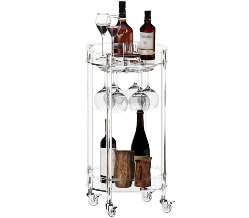 This custom acrylic round 2-tier rolling bar cart offers a modern, sleek design with two spacious tiers for drinks and accessories. Equipped with smooth-rolling wheels and sturdy construction, it’s perfect for bars or home entertaining. Available for wholesale only.