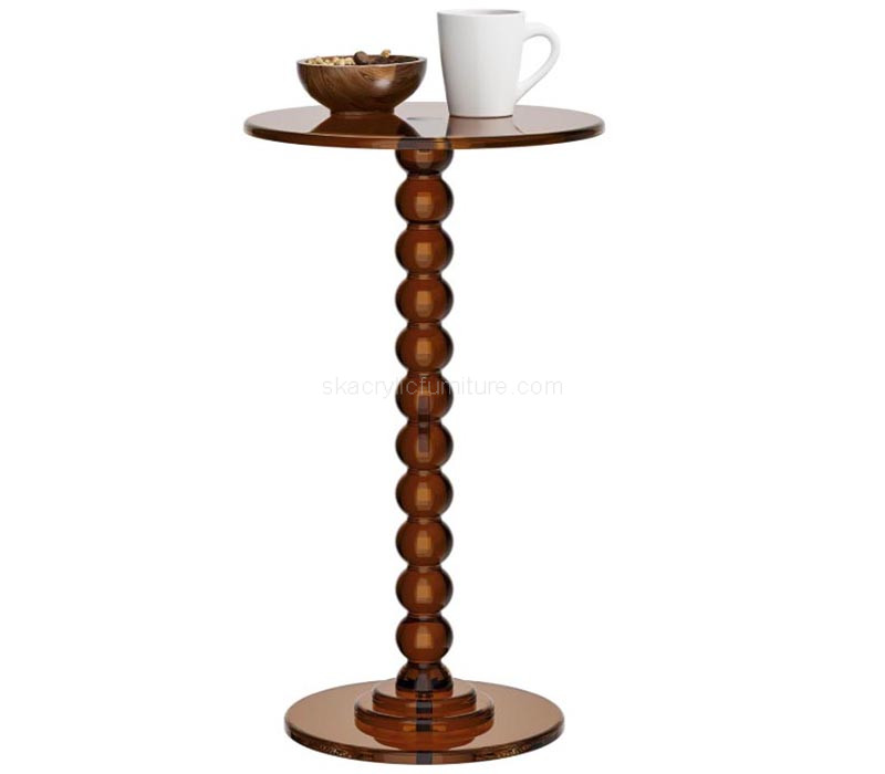 Custom brown acrylic round coffee table with solid post, designed for a sleek and modern look. Crafted from durable acrylic for long-lasting use, it blends style and function effortlessly. Enjoy hassle-free shopping with prepaid duties and taxes, ensuring smooth, door-to-door delivery straight to your home without extra costs.