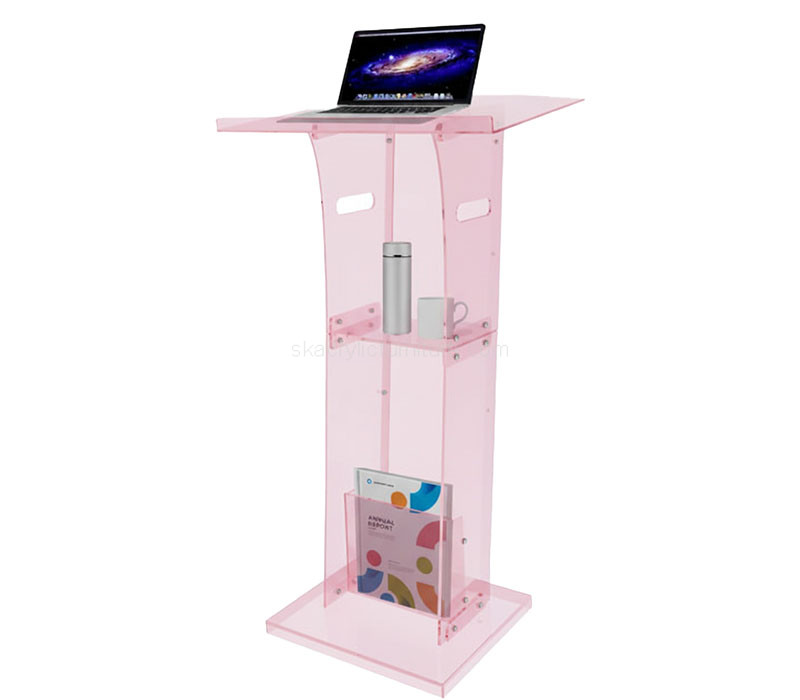 Custom translucent pink acrylic speech podium pulpits, designed with modern elegance and sturdy construction for conferences, churches, and events. The soft pink hue adds a unique, eye-catching touch while maintaining durability and function. Shipping cost includes all taxes and fees, ensuring smooth delivery to the US, Europe, and select Asian countries.