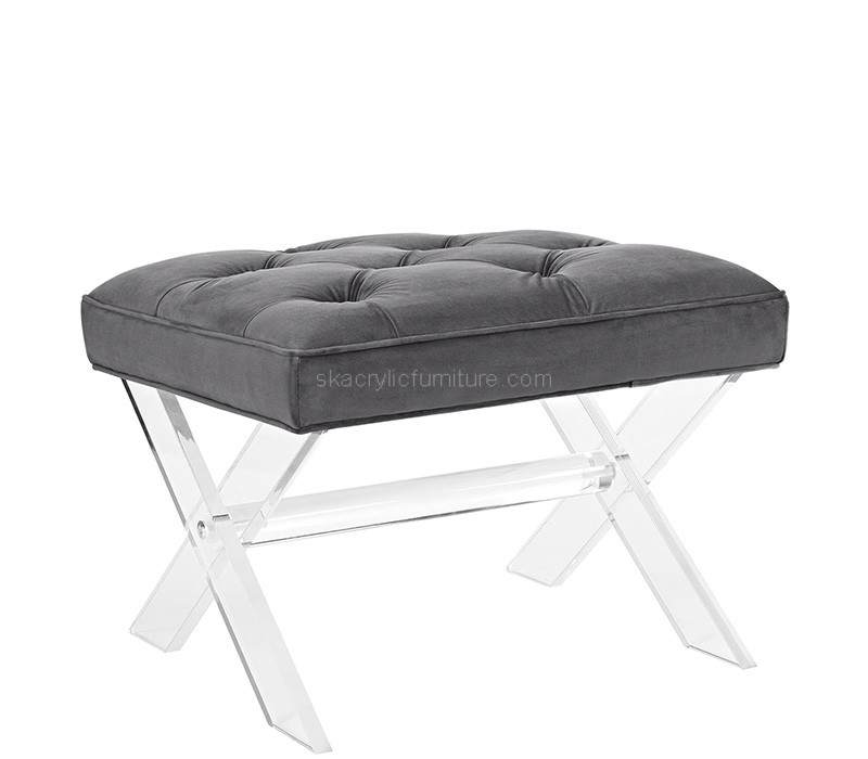 Custom acrylic X-base entryway bench featuring a sleek, modern silhouette with a sturdy X-shaped base for enhanced stability. Crafted from high-quality clear or colored acrylic, it offers durability, easy maintenance, and a light, airy look. Perfect for entryways, hallways, boutiques, or contemporary interior spaces.
