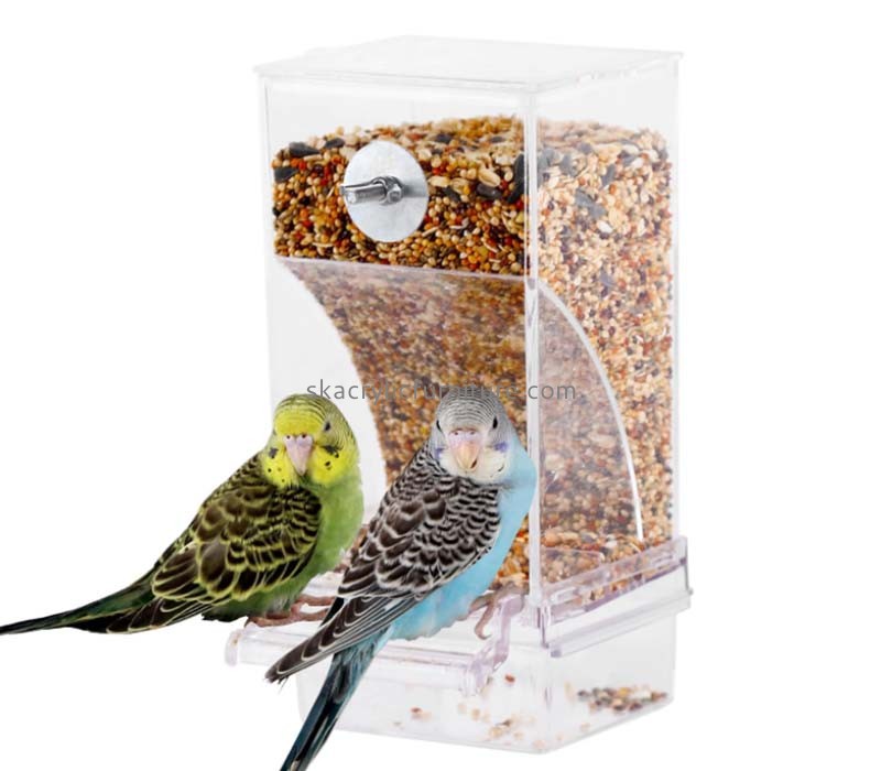 This custom wholesale clear acrylic parrot feeder offers a convenient and transparent solution for feeding pet parrots, combining functionality with visibility. Crafted from high-quality acrylic, it ensures durability and clarity, allowing for unobstructed observation of your feathered friend during feeding sessions.