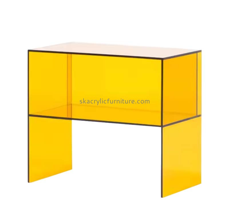 Introducing our custom wholesale translucent yellow acrylic side table with storage, a fusion of functionality and contemporary design. This sleek piece offers both style and utility, featuring a vibrant translucent yellow acrylic construction that adds a bright, modern flair to any space.