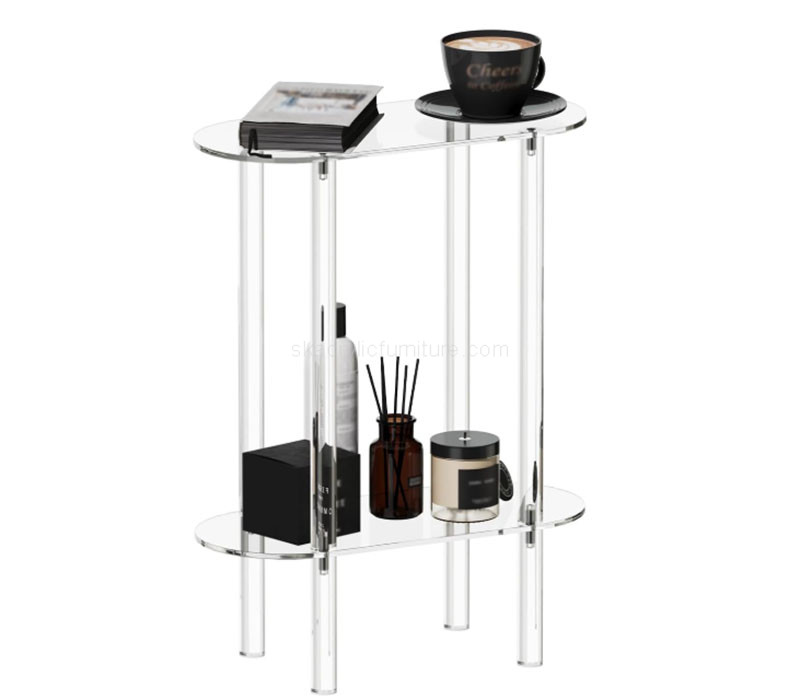 A custom acrylic 2-tier sofa side coffee table, offering a sleek and modern design for any living space. Ideal for wholesale, this stylish table provides functional storage and display space, enhancing your home decor with a minimalist, contemporary touch.