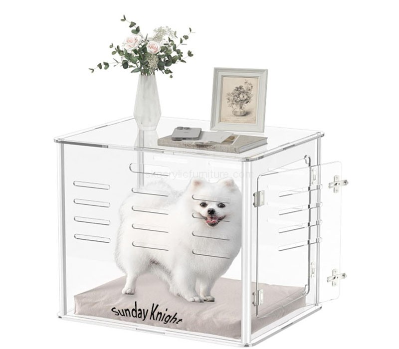 Wholesale custom acrylic dog house with door, combining durability and modern design. Features a transparent structure for visibility, a secure hinged door, and ventilation openings. Lightweight and easy to clean, ideal for providing pets a stylish, cozy shelter.