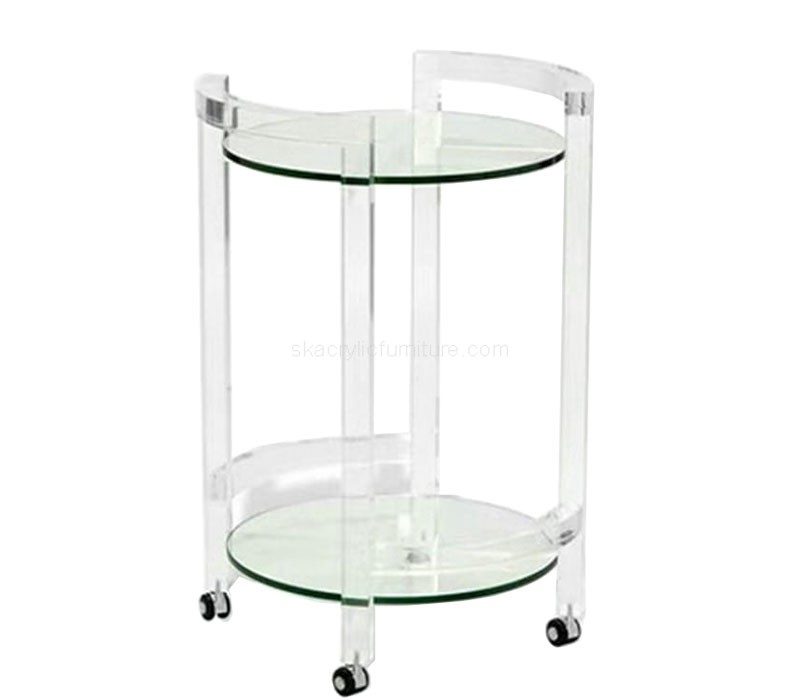 Wholesale custom acrylic side table with wheels, round design, translucent brown, durable, mobile, perfect for modern interiors, easy to clean, functional and stylish.