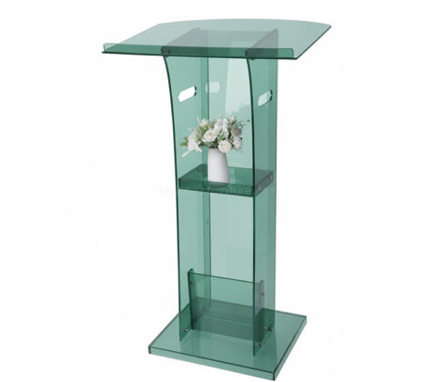 Custom translucent green acrylic presentation podium featuring a clean, contemporary design that enhances any speaking environment. Made from premium acrylic, it offers durability, stability, and a distinctive modern look. Ideal for conferences, classrooms, exhibitions, churches, and corporate events, delivering both functionality and visual appeal.